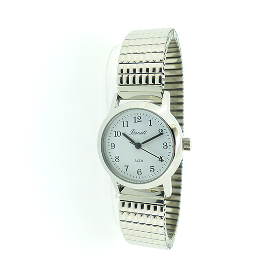 Bonett dameur, stål. Hvit tall skive, flexilenke.